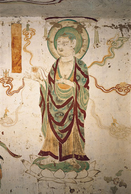 前室东壁北侧的菩萨,项饰璎珞,头戴三珠宝冠,左手平伸托宝珠、左臂自然弯曲,右手自然下垂、手长过膝盖,飘带绕双臂一周,肩宽腰细,下身穿羊肠裙,神态悠闲自然地站立在莲花上。