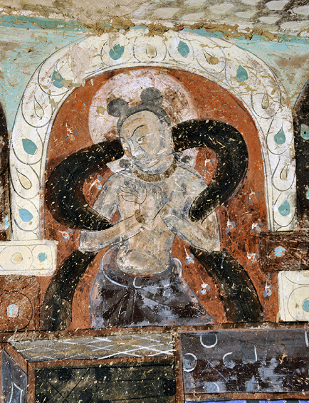 北向面为圆券形双树龛,由双树组成龛柱、龛楣,浮塑龛柱,绘龛眉。这种形式最早见于莫高窟第275窟思维菩萨像龛。龛内清修坐佛一身,存北魏画飞天、菩萨数身。龛顶一对飞天造型生动,已摆脱早期那种僵硬的姿态,呈现出与莫高窟北魏、西魏时期飞天一样的轻盈与活泼。塔座存西魏重画忍冬纹边饰,下存男女供养人、比丘、比丘尼、力士各数身。
