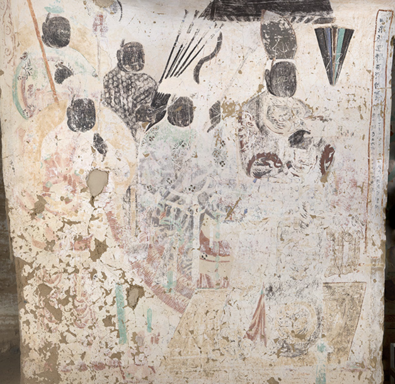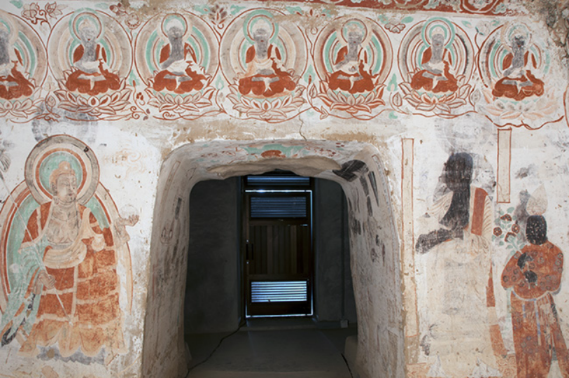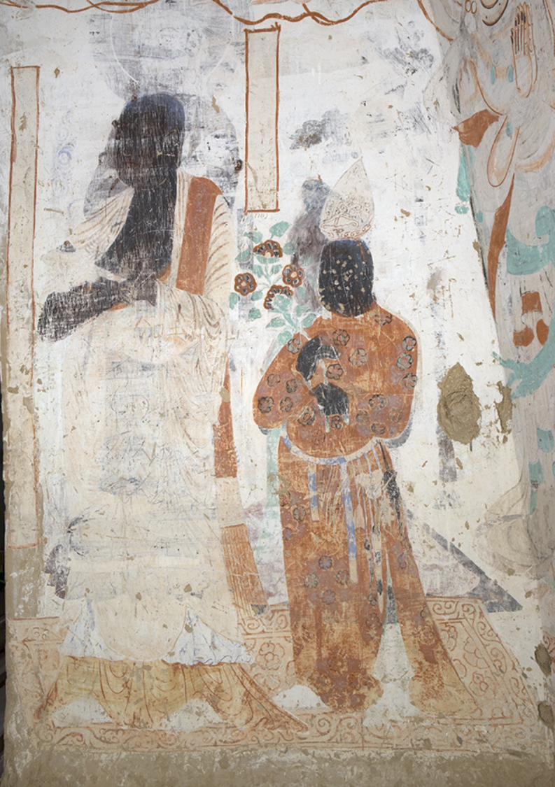 甬道顶部残存回鹘时期绘制的立佛一身。甬道西壁是回鹘可汗与四身男侍的供养像。回鹘又称回纥,是我国维吾尔族和裕固族的先民,两汉时期称为丁零(或丁令),南北朝时期称为高车。回鹘是隋唐之际所用的称呼,初游牧于蒙古草原,后定居于西域和河西走廊一带。公元8—9世纪之间,回鹘一度称雄于蒙古草原,后由于内讧及瘟疫,势力受挫,公元840年前后,回鹘政权覆亡。此后,余众分三批向西迁徙,迁至葱岭以西的回鹘建立了喀喇汗(亦称黑韩)王朝;迁至河西的回鹘,盘据甘州,史称甘州回鹘或河西回鹘;迁至西州的回鹘即高昌回鹘。部分回鹘部众散居于敦煌及周边地区,在归义军政权的统治下与各民族交融。十世纪后期至十二世纪初叶,世居瓜(现瓜州)沙(现敦煌)地区的回鹘族,逐渐形成一股强大势力,在敦煌曹氏家族衰微、无力抵御外力入侵的情况下,瓜沙地区的回鹘族于1030年前后掌握了瓜沙政权,史称“沙州回鹘”。