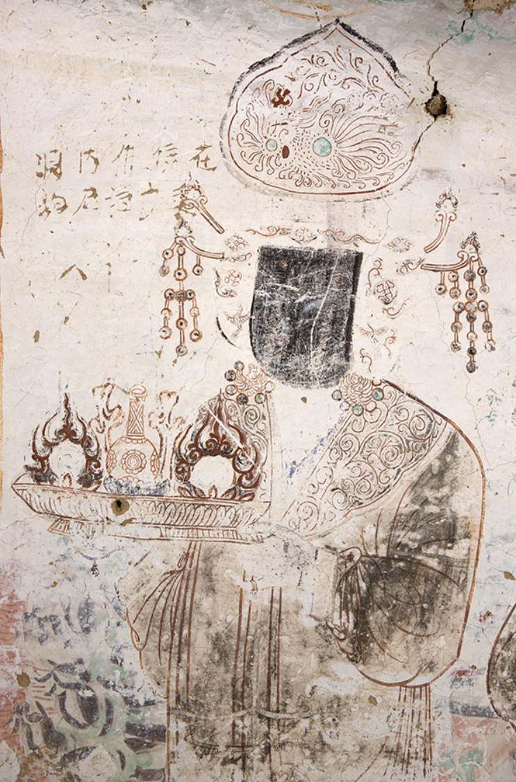 甬道东壁是回鹘女供养人两身,通过回鹘女供养北侧可以看到五代时期绘制的千手眼观音一铺,南侧重层壁画下面露出的一身菩萨一身,学者推断是宋代绘制的。