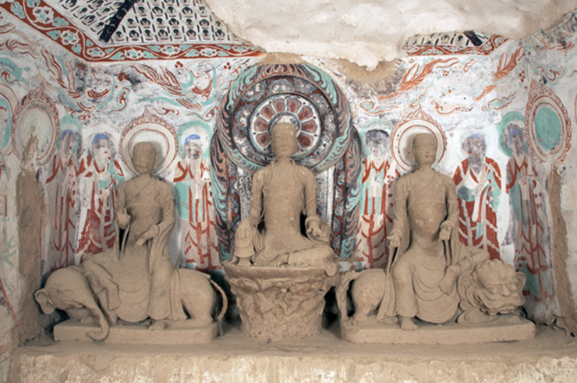 主室北壁的佛床上是民国塑坐佛一身、乘狮文殊一身、乘象普贤一身,而北壁中间则保留有晚唐时期制作的浮塑佛背光,两侧却是回鹘风格的飞天与弟子各两身、一铺火焰纹塑像项光。北壁西侧上部底层露出了唐代绘制的赴会佛。佛床两端残存有回鹘女供养人各五身。