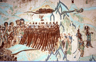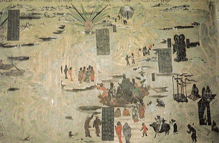 此窟建于武则天时期,主室前部人字披顶,后部中心塔柱。塔柱南北西三面都不开龛,南面画卢舍那佛一铺,西面画药师佛一铺,北面画灵鹫山说法图一铺。南北壁前部壁前、塔柱东向面壁前各塑一佛二菩萨立像。南壁后部画涅槃经变,西壁开龛,塑涅槃像,北壁后部画维摩诘经变。东壁门南画一佛五十菩萨图,门北画灵鹫说法图一铺。前室原有《李君莫高窟佛龛碑》,即建窟功德记。南壁涅槃经变 出殡图李唐一统天下,社会安定,百姓乐业,经...