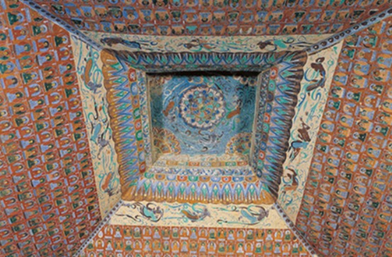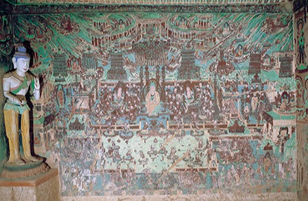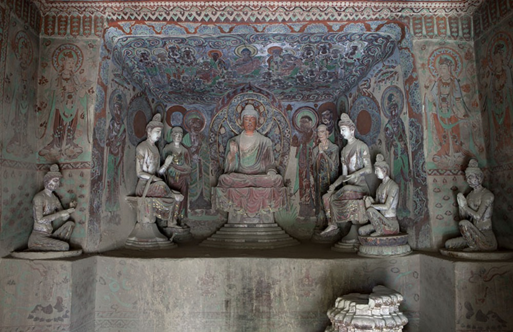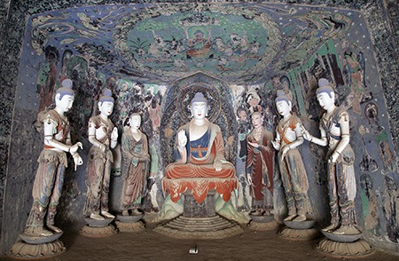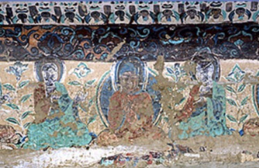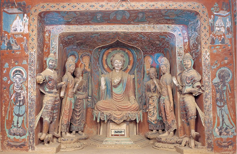 莫高窟第328窟是开凿于初唐时期的代表洞窟。此窟窟形平面为正方形,窟顶是覆斗形,中心绘交杵莲花藻井图案,四披绘棋格团花图案;西壁敞口龛内绘塑结合,表现佛、弟子、菩萨,龛顶绘弥勒说法图;南壁北壁及东壁上方均为净土变,东壁下方为西夏时期的八身供养菩萨。在莫高窟现存的两千多身彩塑中,各个时代保留的雕塑原作有一百四十余身,其余大都经过后代重绘或重塑。第328窟西壁佛龛内的群像,均为唐代原作,具有很高的艺术价...