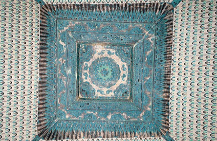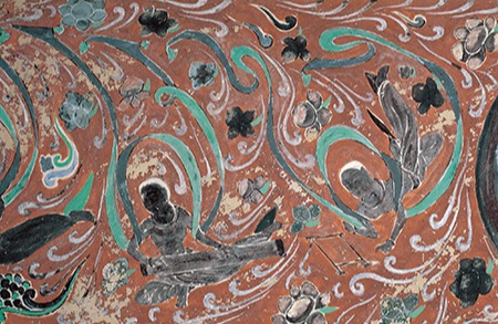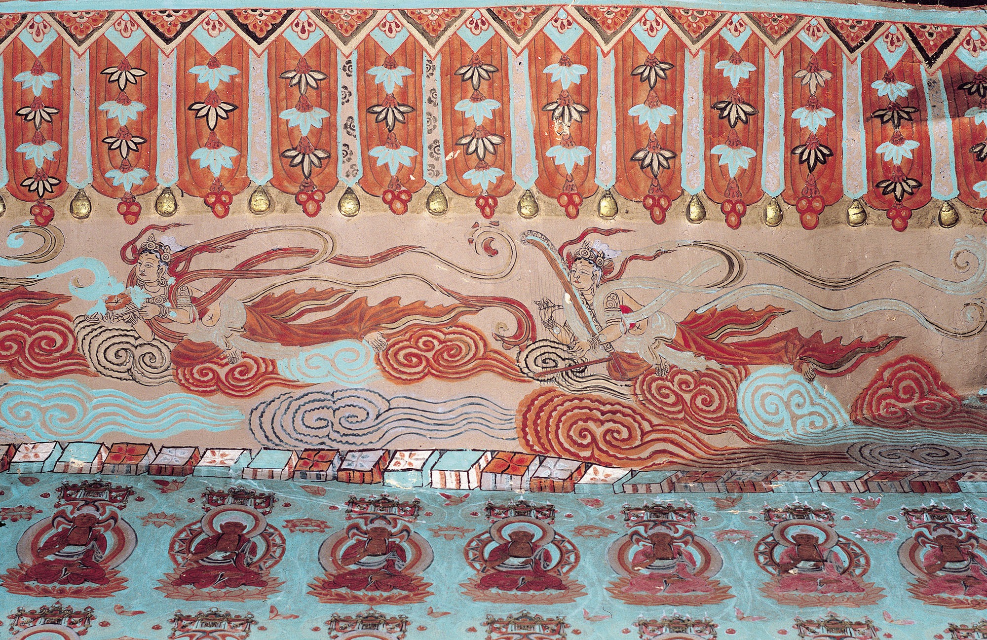 莫高窟第327窟-窟顶南披-献花伎乐飞天-西夏C130 P142修建年代:西夏(清重修)洞窟形制:覆斗形顶,西壁开一龛内容:前室西壁门南画文殊变。主室窟顶藻井浮塑团花莲花井心,回纹、卷草铺于四披(残)。四披画棋格团花、垂幔、飞天各存一部。西壁盝顶帐形龛内西夏塑七佛、四菩萨(清修)。唐塑二菩萨(从别处移来)。马蹄形佛床。龛顶中央画棋格团花,南、西、北披画垂幔。龛内西壁画飞天四身、花卉。南、北壁各画飞天四身、项...