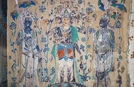 第331窟是初唐时期开凿的洞窟,洞窟前室、甬道均绘制有壁画,前室壁画保存完整,前室西壁门上是五代时期绘制的地藏菩萨、水月观音,门南、北各画天龙八部,门南被美国人华尔纳盗走一方壁画。甬道顶部为盝形顶,顶中央为五代时期绘制的十一面观音变一铺,南、北披画趺坐佛各六身,甬道顶部及两披壁画保存完好,色泽鲜艳。西壁龛顶 飞天伎乐洞窟主室为覆斗形顶的方形窟,西壁开一斜顶敞口佛龛,龛内初唐塑一趺坐佛、二弟子、二菩...