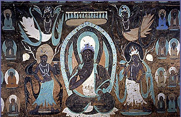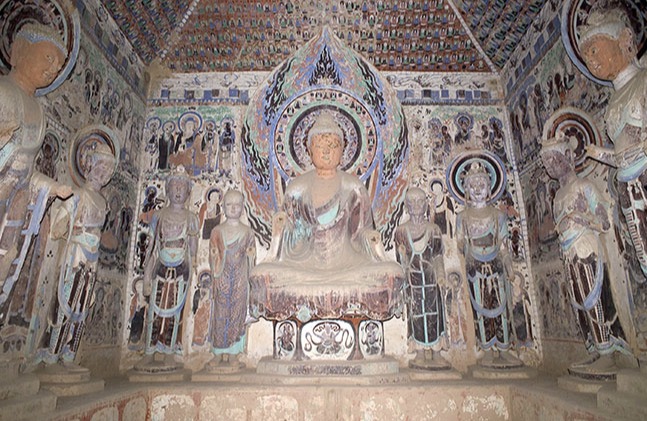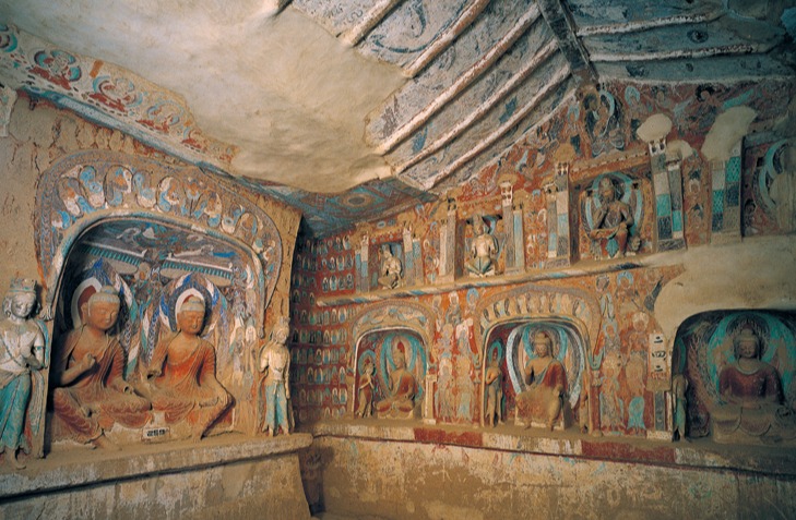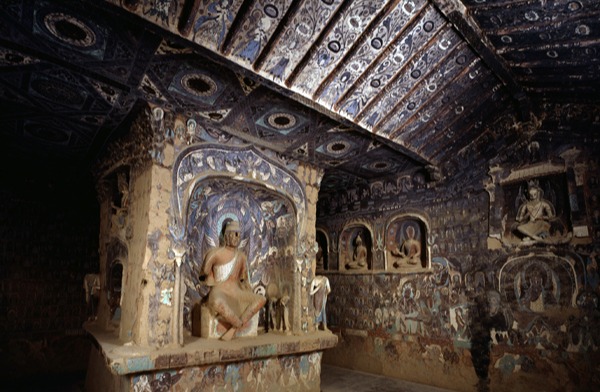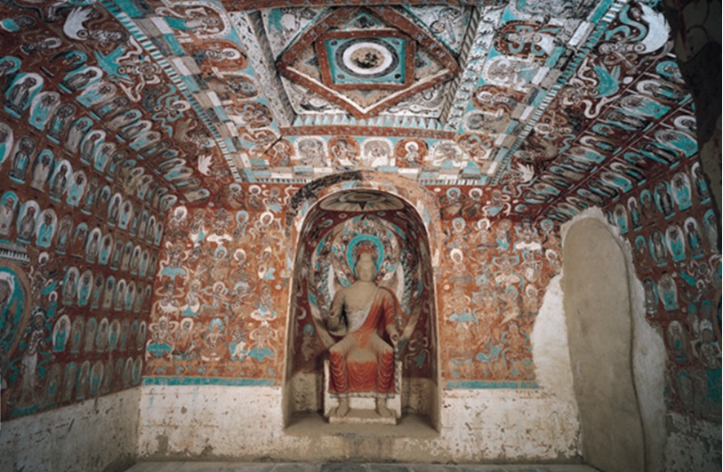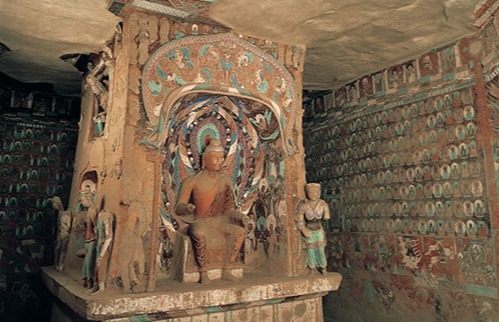 时代:北魏(西夏重修) 形制:前部人字披顶,后部平顶,有中心塔柱,柱东向面开一龛,南西北向三面上、下层各开一龛。