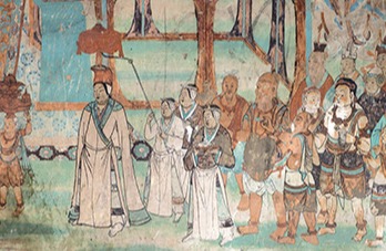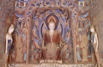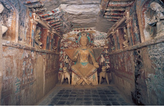 时代:十六国(宋重修) 形制:纵向盝顶,西壁塑像,南、北壁上部各开三龛。