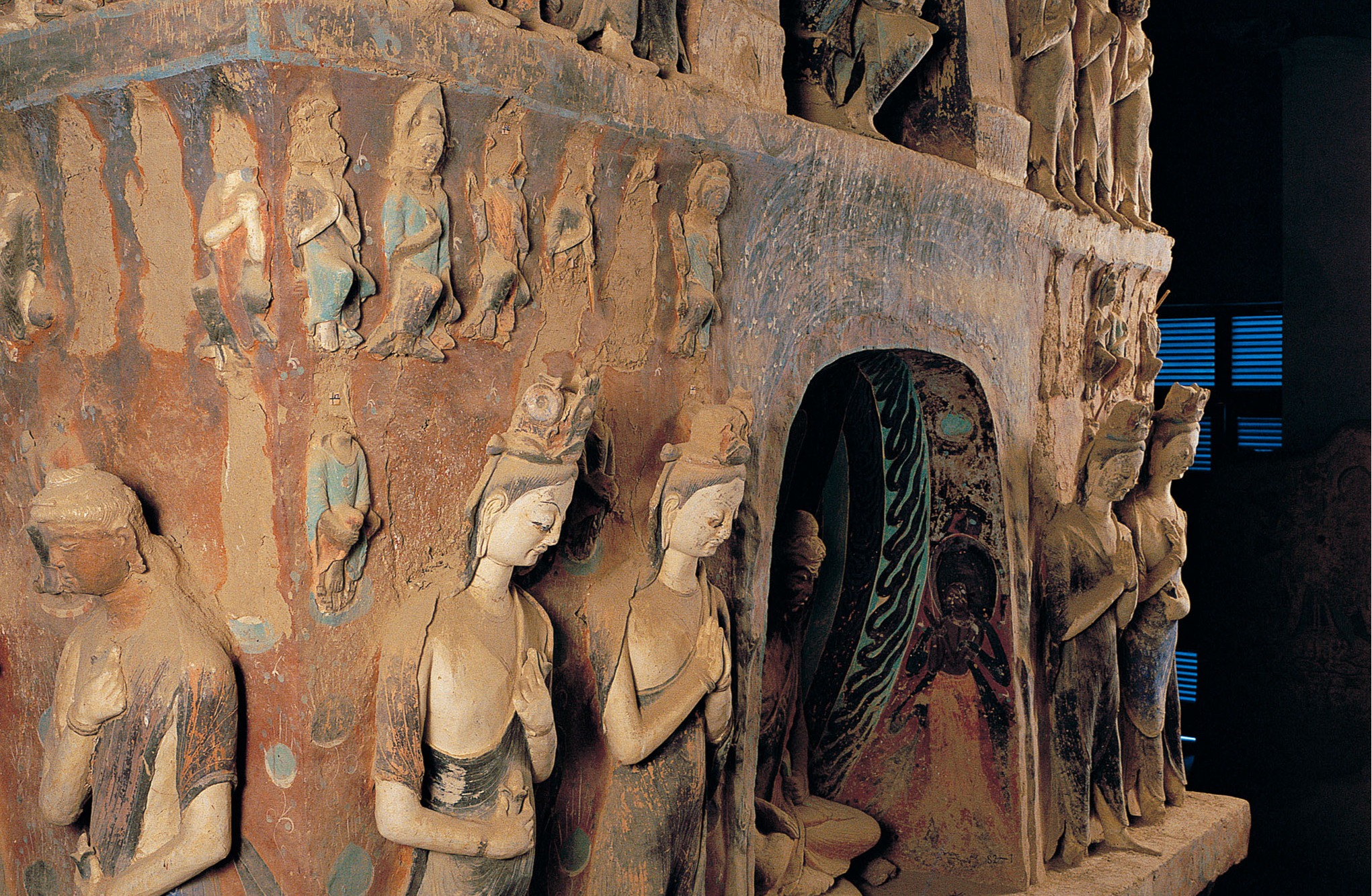 时代:北魏(宋重修) 形制:前部人字披顶,后部平棋顶,有中心塔柱,柱东向面开一龛,南西北向三面上、下层各开一龛。