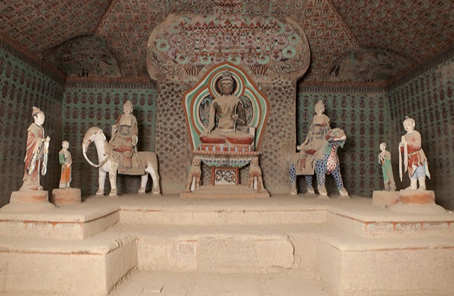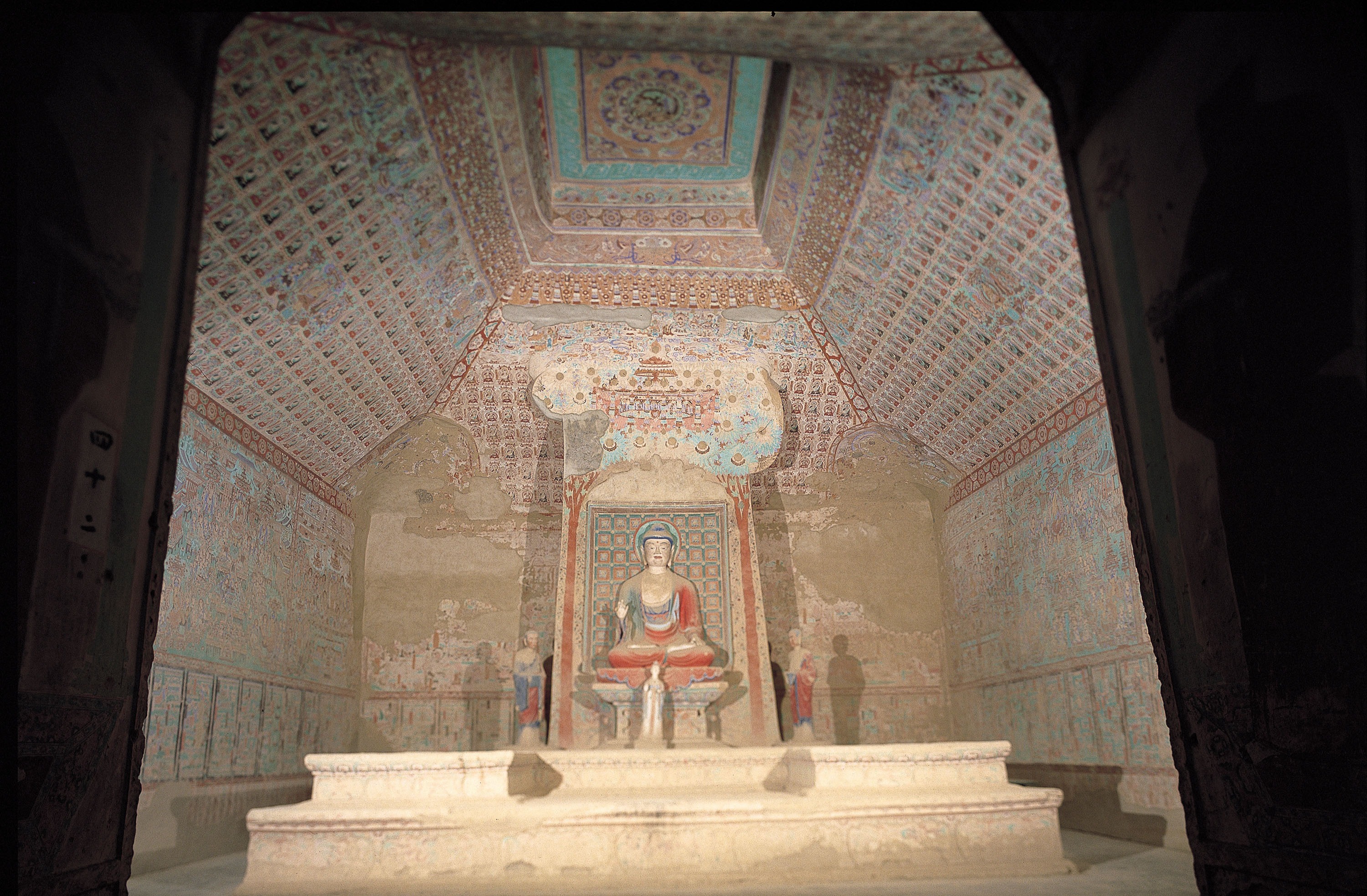 时代:晚唐(五代、元、清重修) 形制:覆斗形顶,设中心佛坛,坛上背屏连接窟顶。