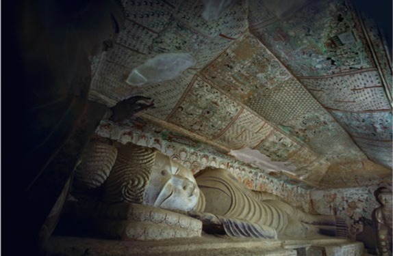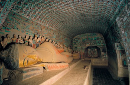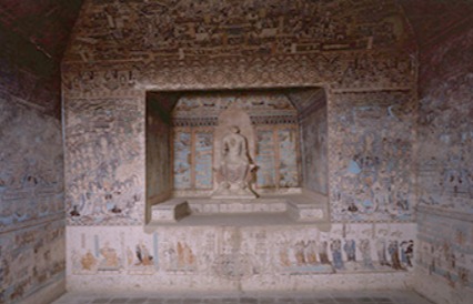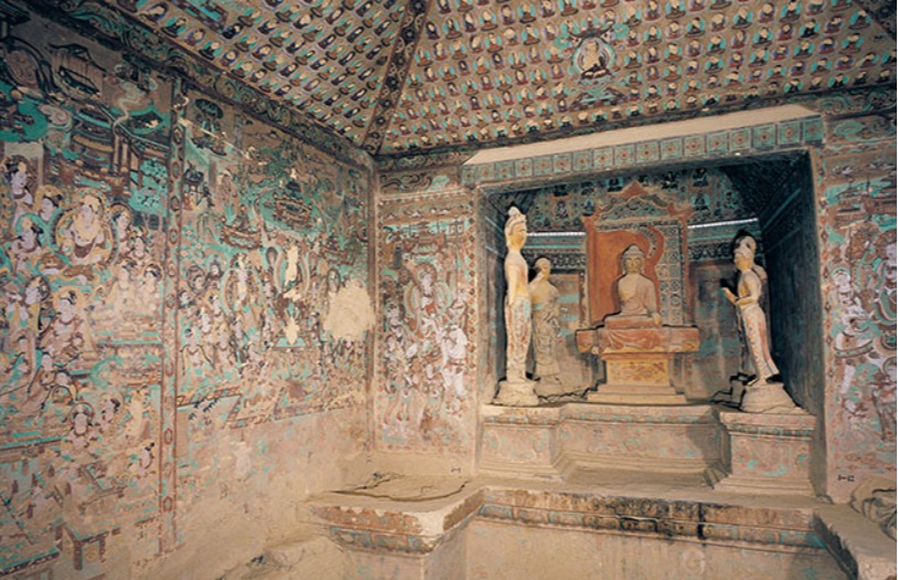 时代:盛唐(晚唐、西夏、清重修) 形制:拱形顶,西壁设涅槃佛坛,南、北壁各开一龛。