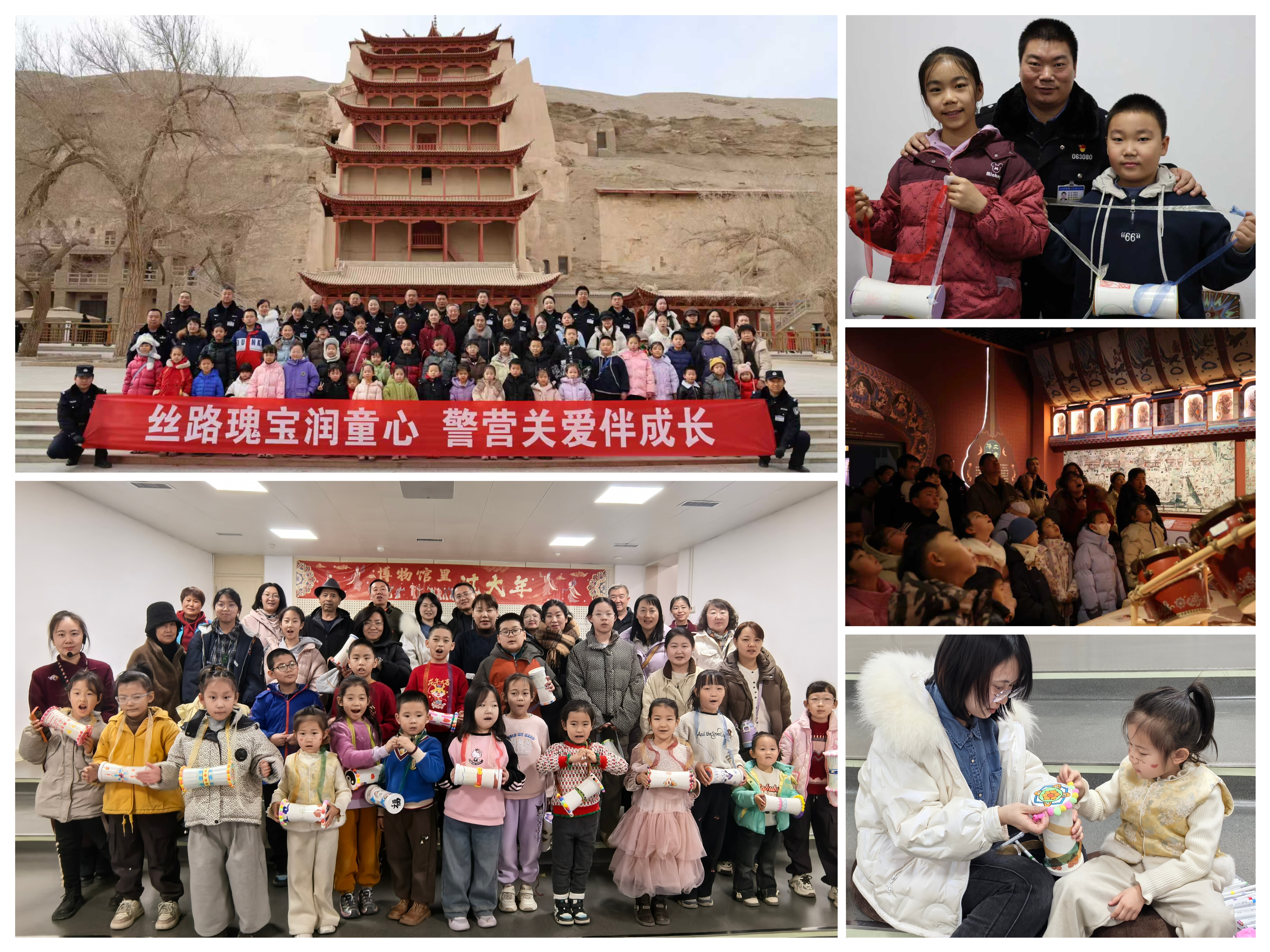 2月5日,新春公益社教活动首期在敦煌研究院启幕,50组民警亲子家庭共同参观“敦和万象——敦煌石窟乐舞专题展”。飞天凌空,腰鼓欲鸣,壁画中的乐舞图景在沉浸式数字展厅中展示。孩子们仰首凝望,父母俯身低语,千年文明在目光交汇处有了温度。观展后,家长与孩子携手围坐,共制手工作品——纸间裁出莲花纹,笔下描摹琵琶形,亲子协作间,流淌着寻常人家的脉脉温情。