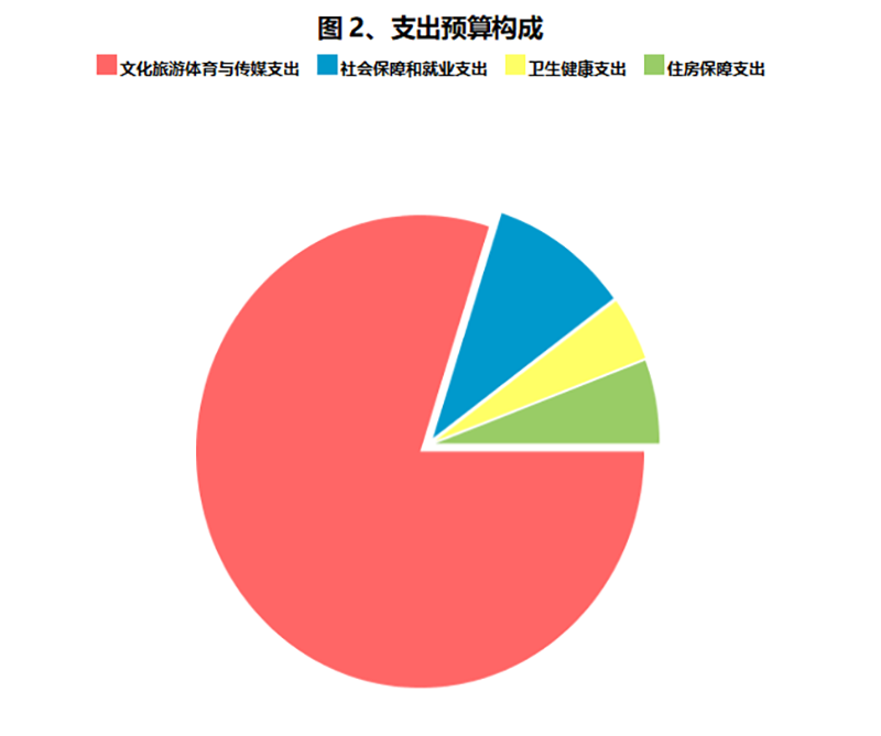 2026年一般公共预算支出422.70万元,包括:文化旅游体育与传媒支出338.00万元、社会保障和就业支出42.10万元、卫生健康支出18.48万元、住房保障支出24.12万元。